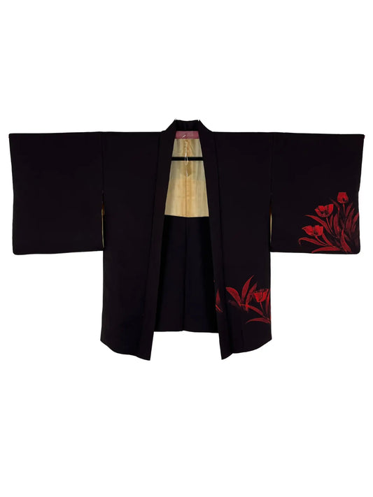 Vintage Black Haori - Crimson Tulips Return -