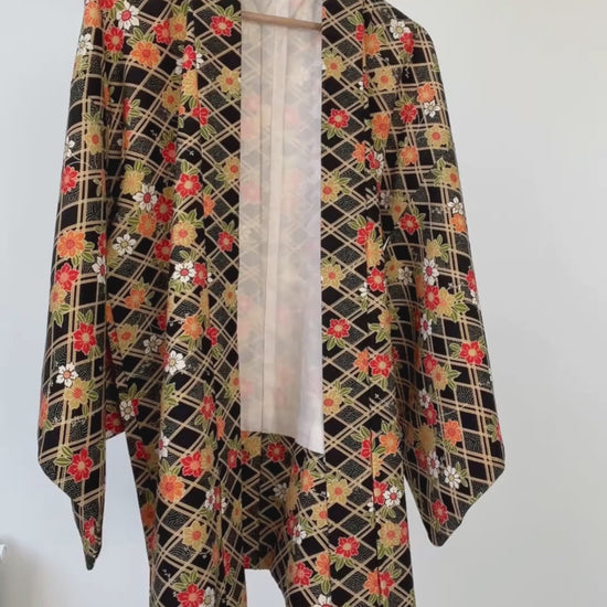 Der Haori zeichnet sich durch ein auffälliges Design mit leuchtend orangefarbenen und gelben Blüten in voller Blüte auf einem schwarzen Hintergrund aus. Das im Gittermuster angeordnete Blumenmuster sorgt für einen auffälligen und auffälligen Look.