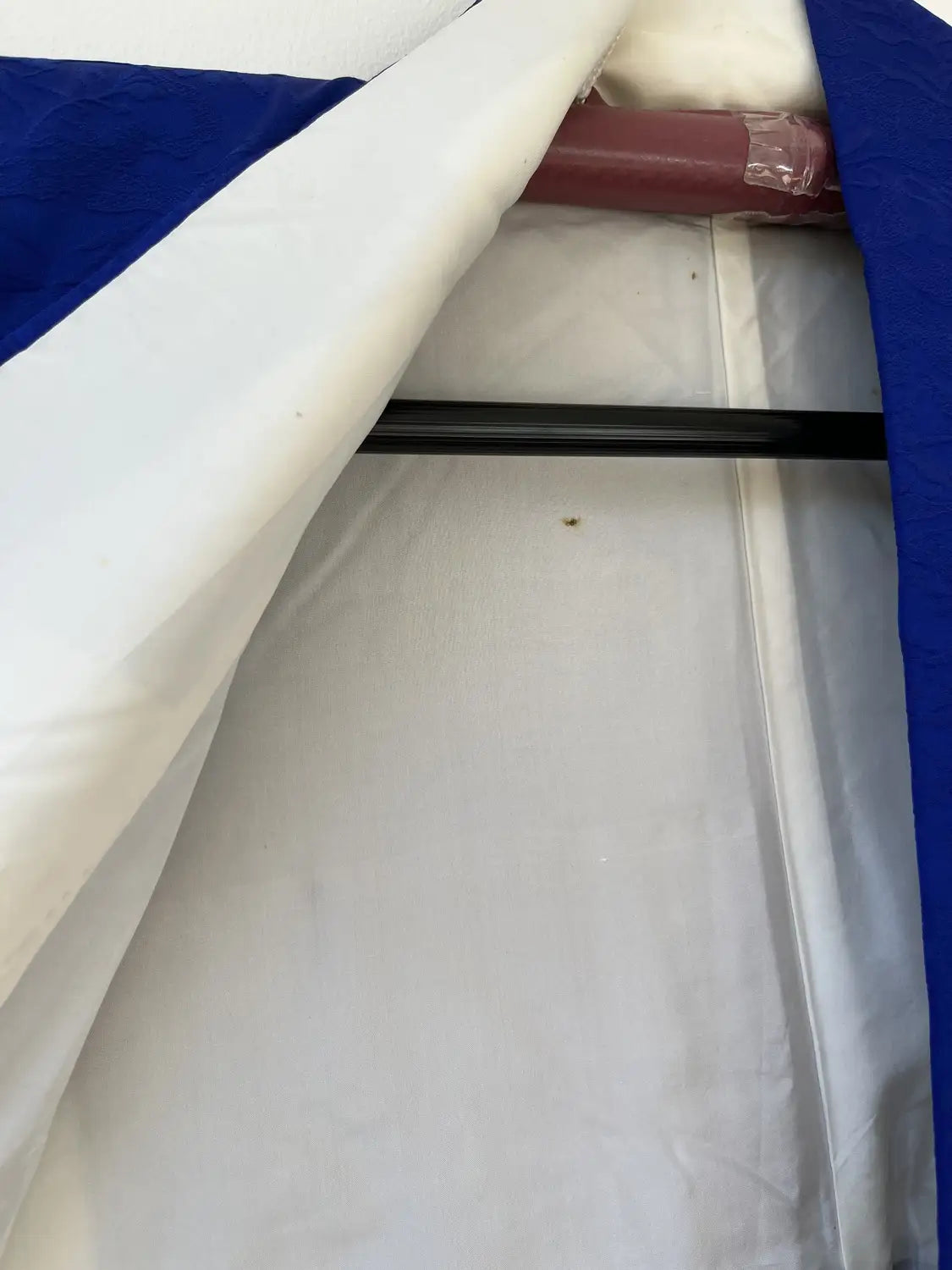 Der äußere Seidenstoff ist insgesamt in einem sehr guten Zustand, weist jedoch stellenweise einige Flecken und Markierungen auf.