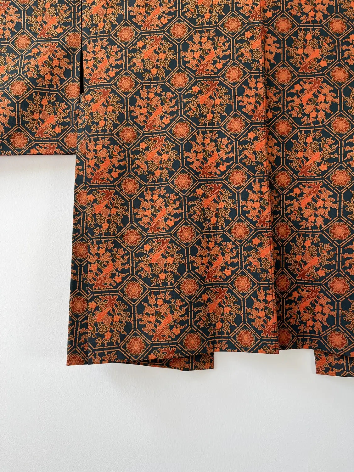 This is a high-quality haori in excellent condition, with a navy base and striking orange patterns.