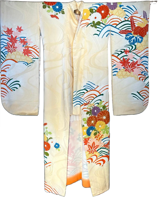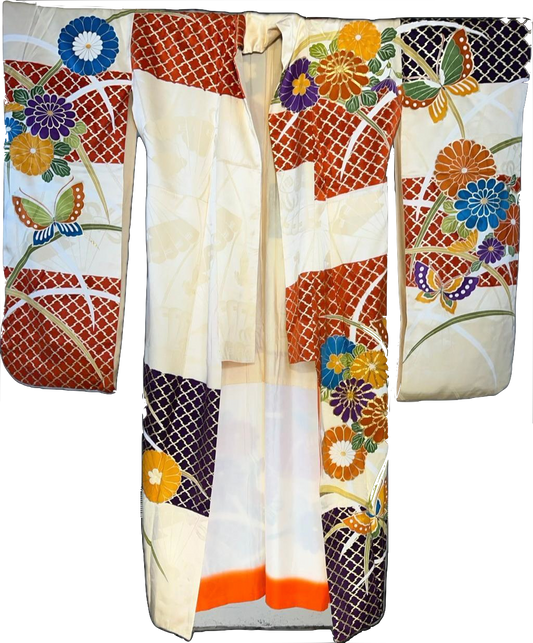 Furisode vintage - Fleurs CreamWhite en teinture Katazome -