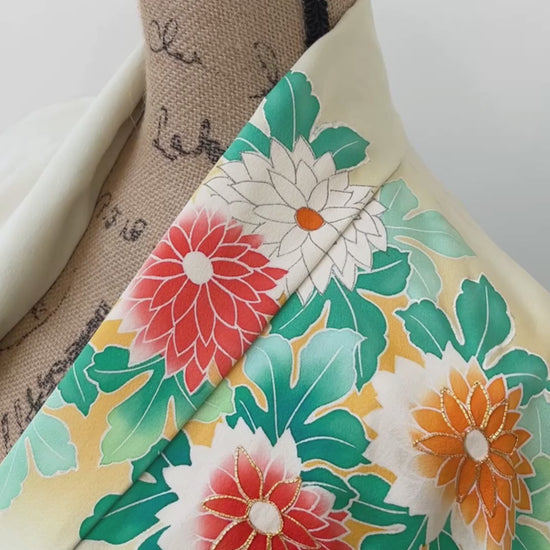 Furisode vintage - Flux de fleurs blanc-vert -