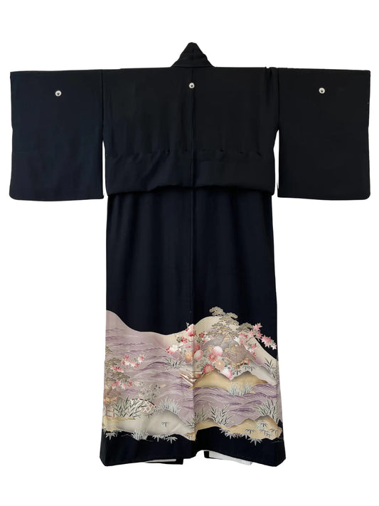 Vintage zwarte tomesode - Een symbolisch dorp Shochikubai - Origineel Halleluja-arrangement