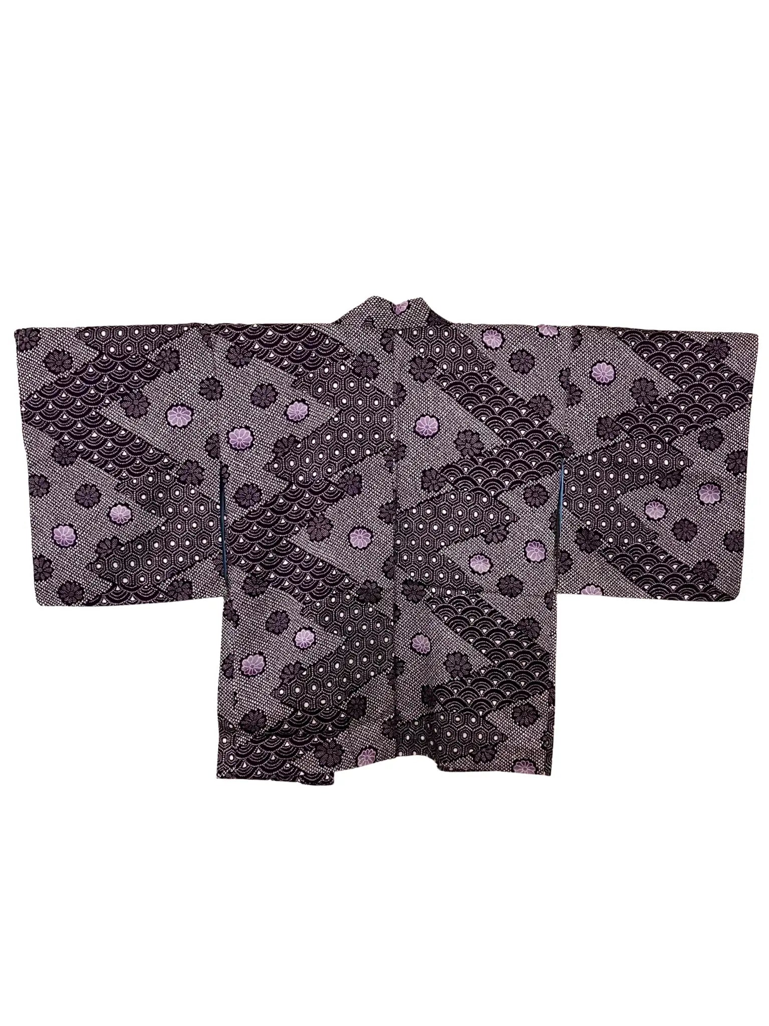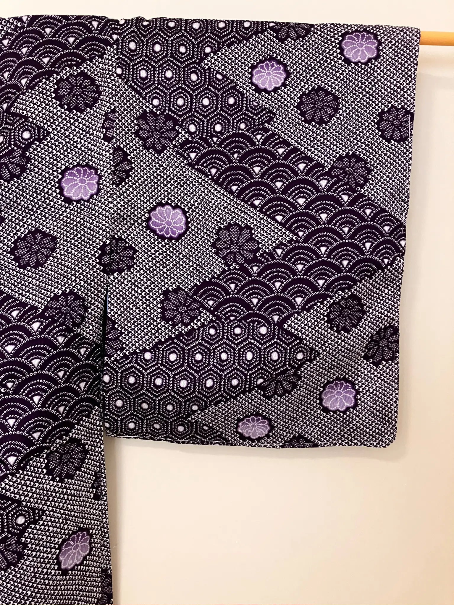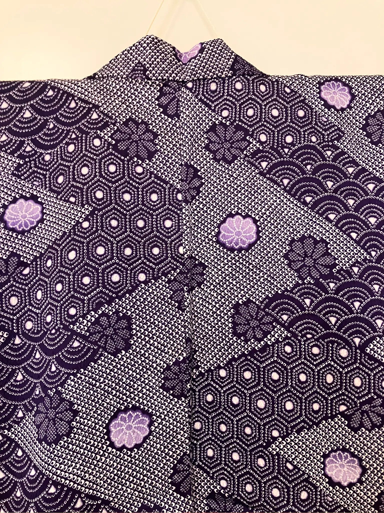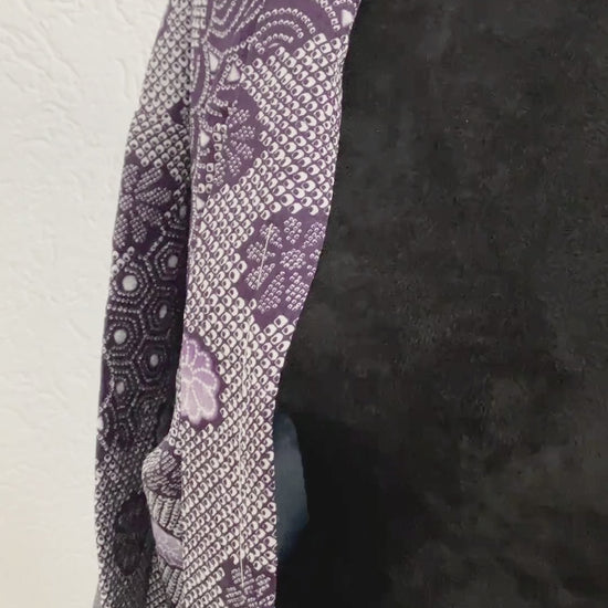 This is a stunning haori in a deep, elegant shade of purple. In ancient Japan, purple was considered a noble color, reserved for people of high status. The bold zigzag pattern, reminiscent of lightning, gives this piece a striking impact. The shibori texture is beautifully raised, adding dimension and a refined feel to the fabric.