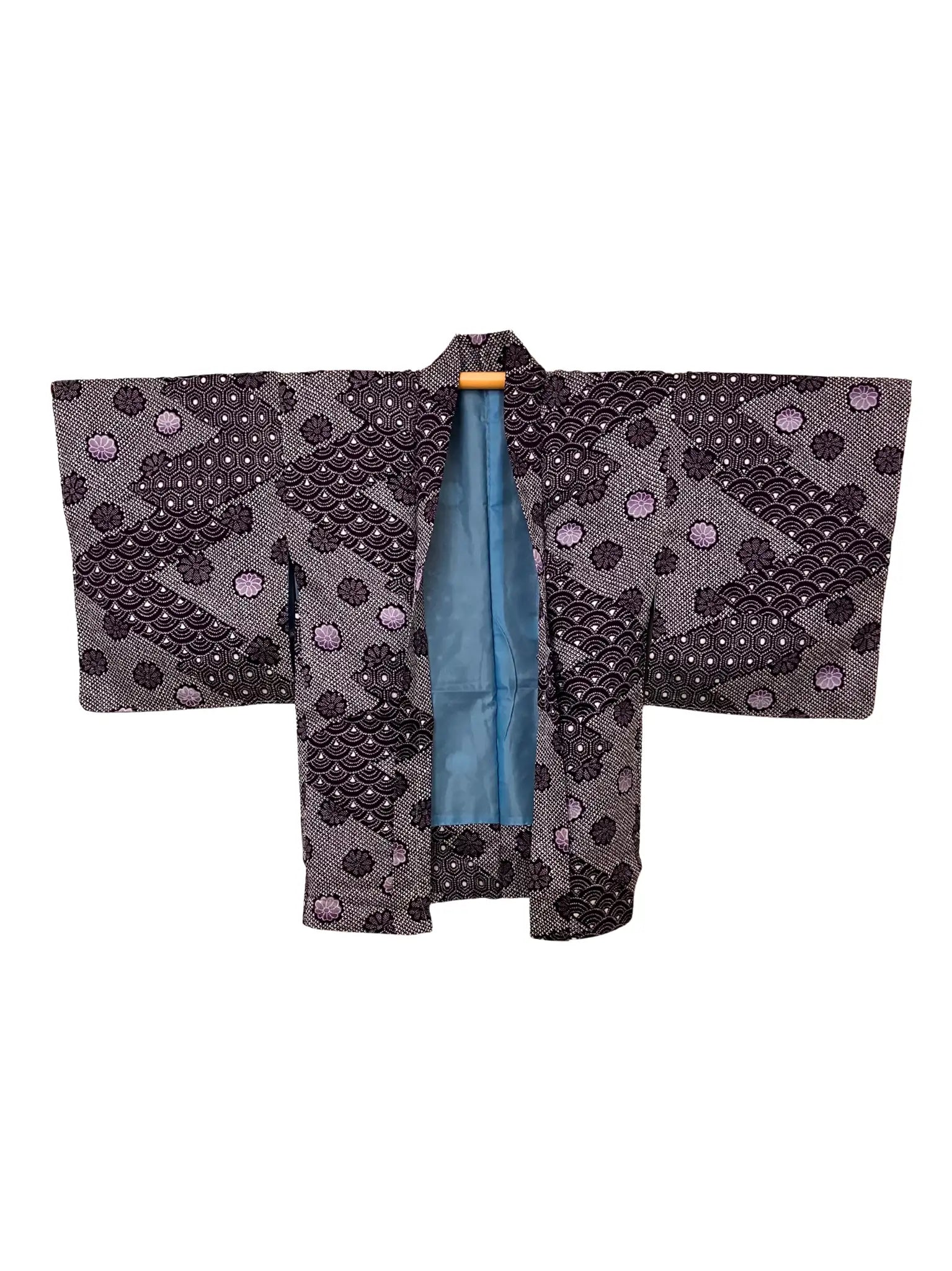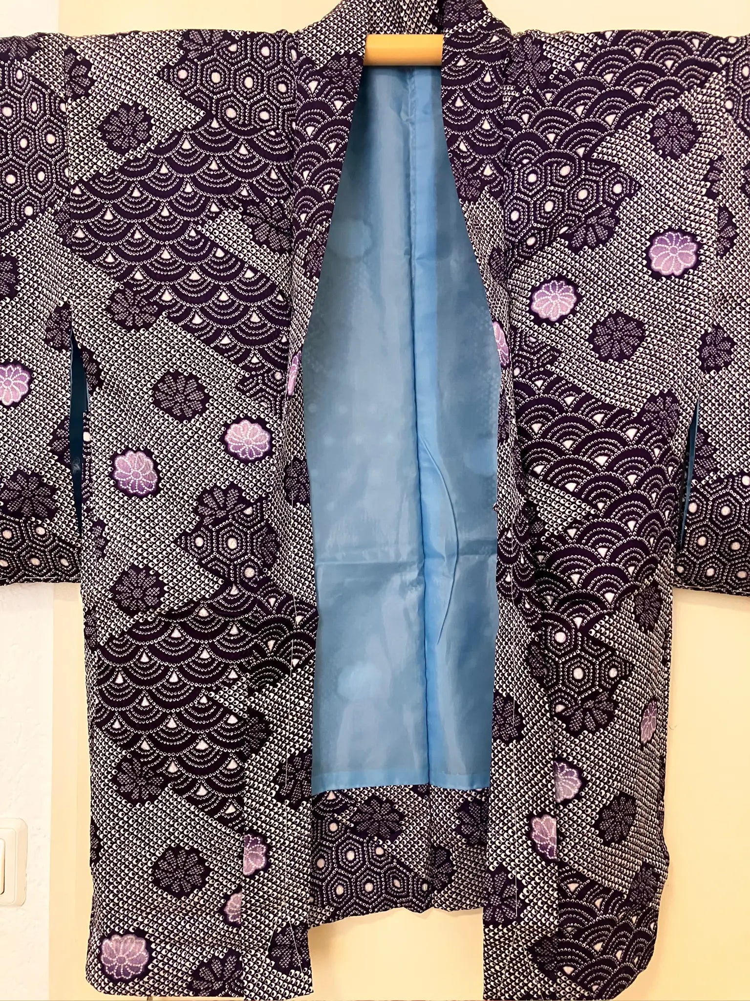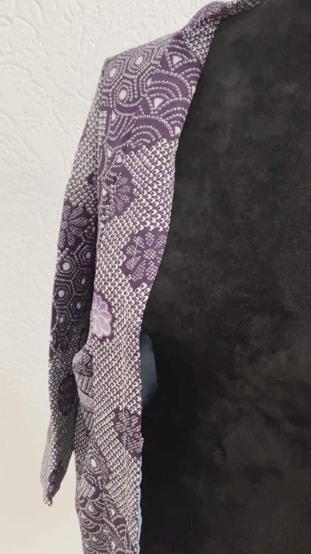 This is a stunning haori in a deep, elegant shade of purple. In ancient Japan, purple was considered a noble color, reserved for people of high status. The bold zigzag pattern, reminiscent of lightning, gives this piece a striking impact. The shibori texture is beautifully raised, adding dimension and a refined feel to the fabric.