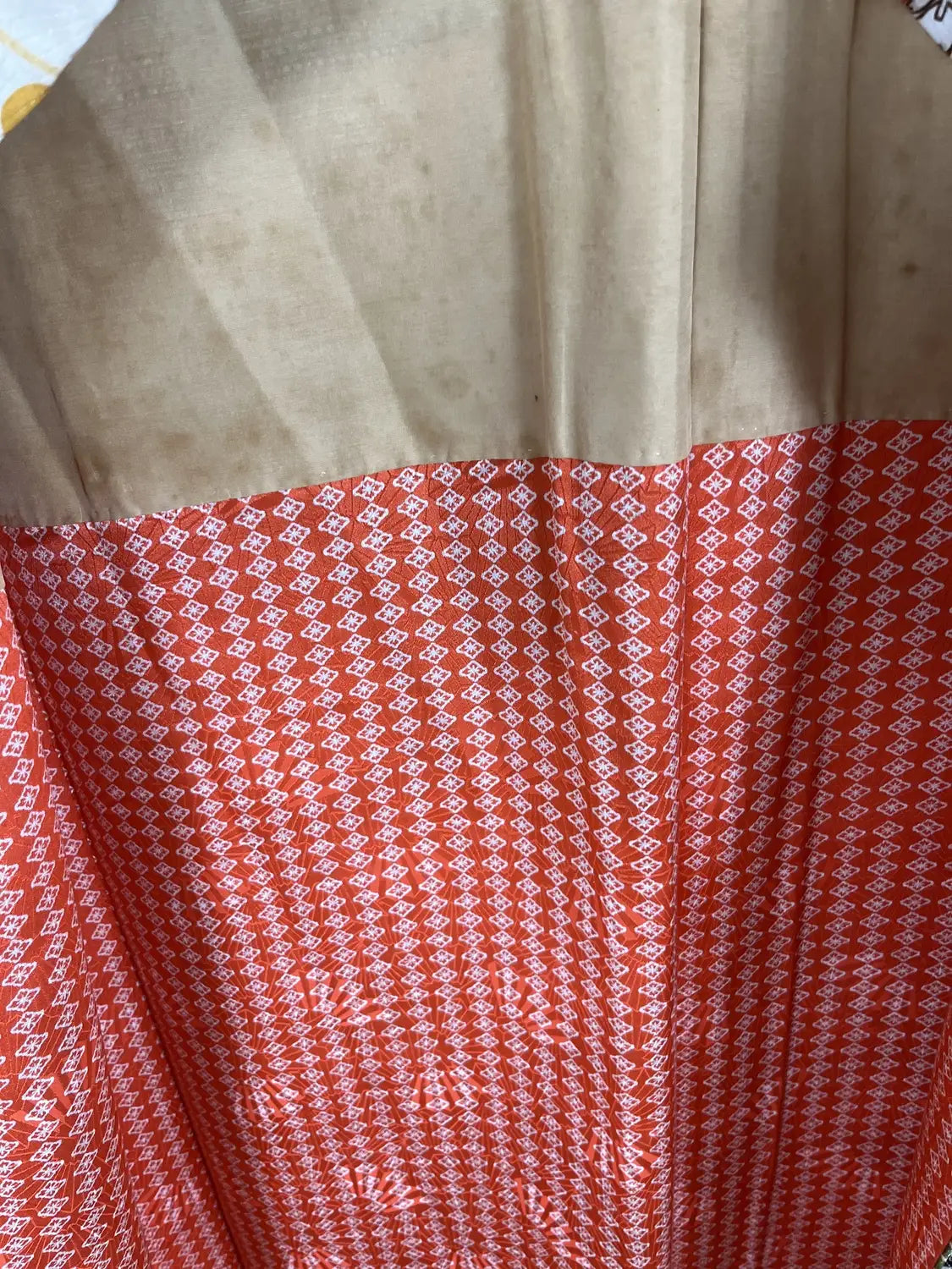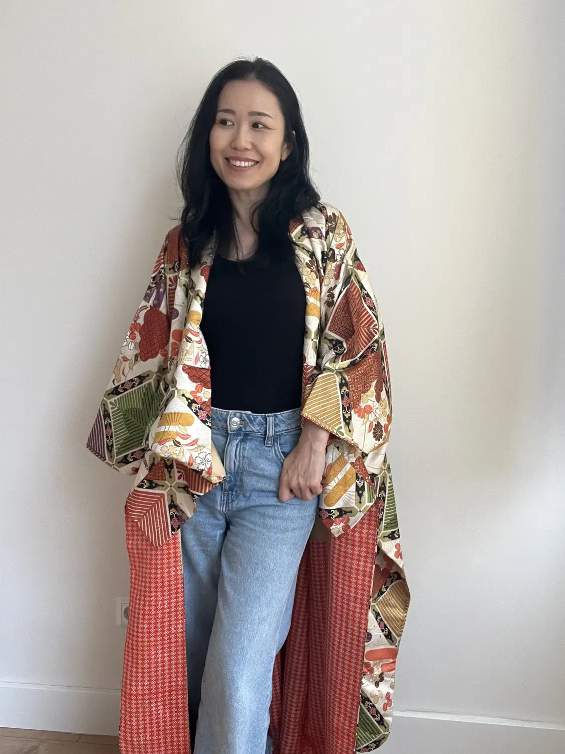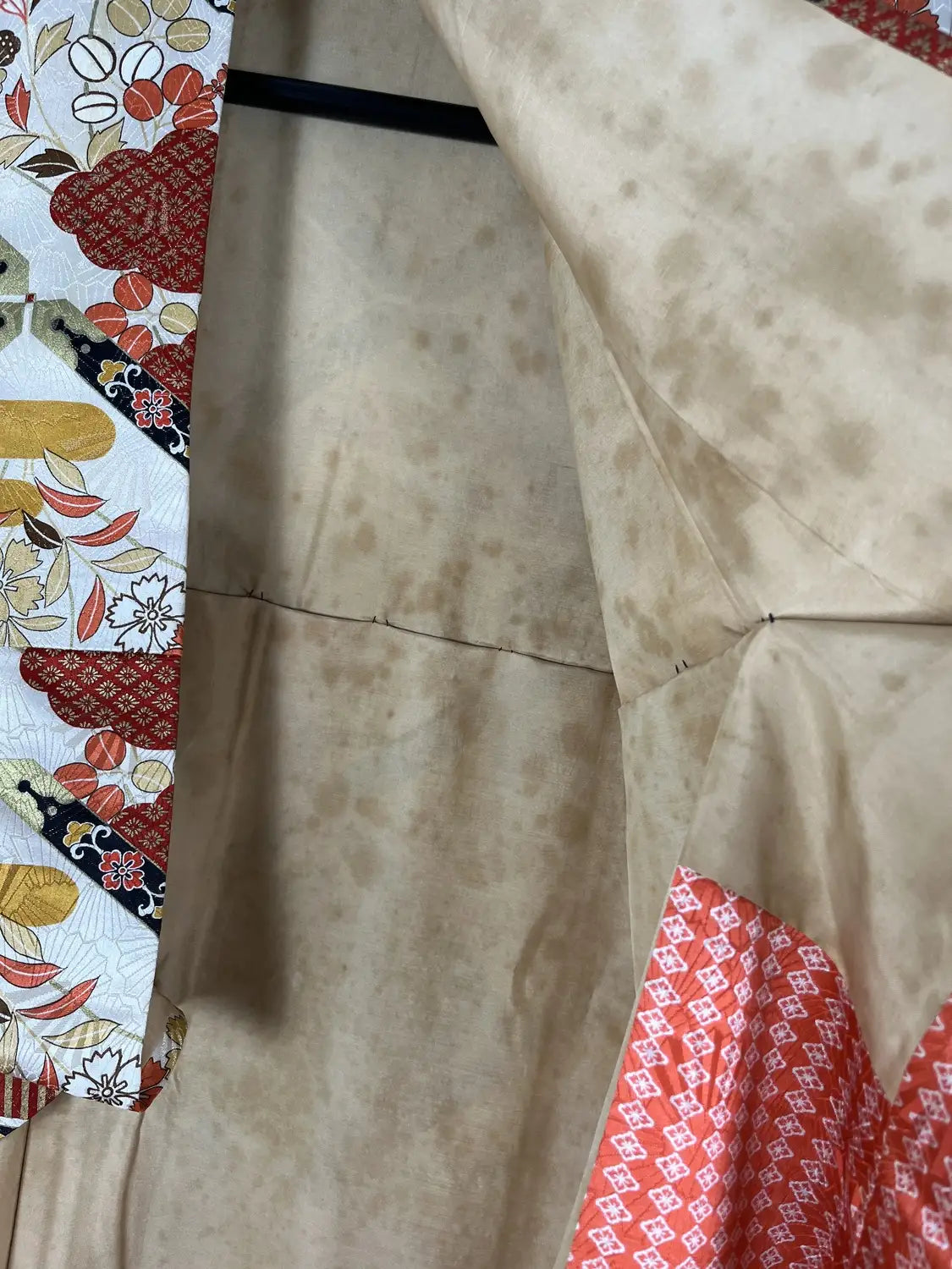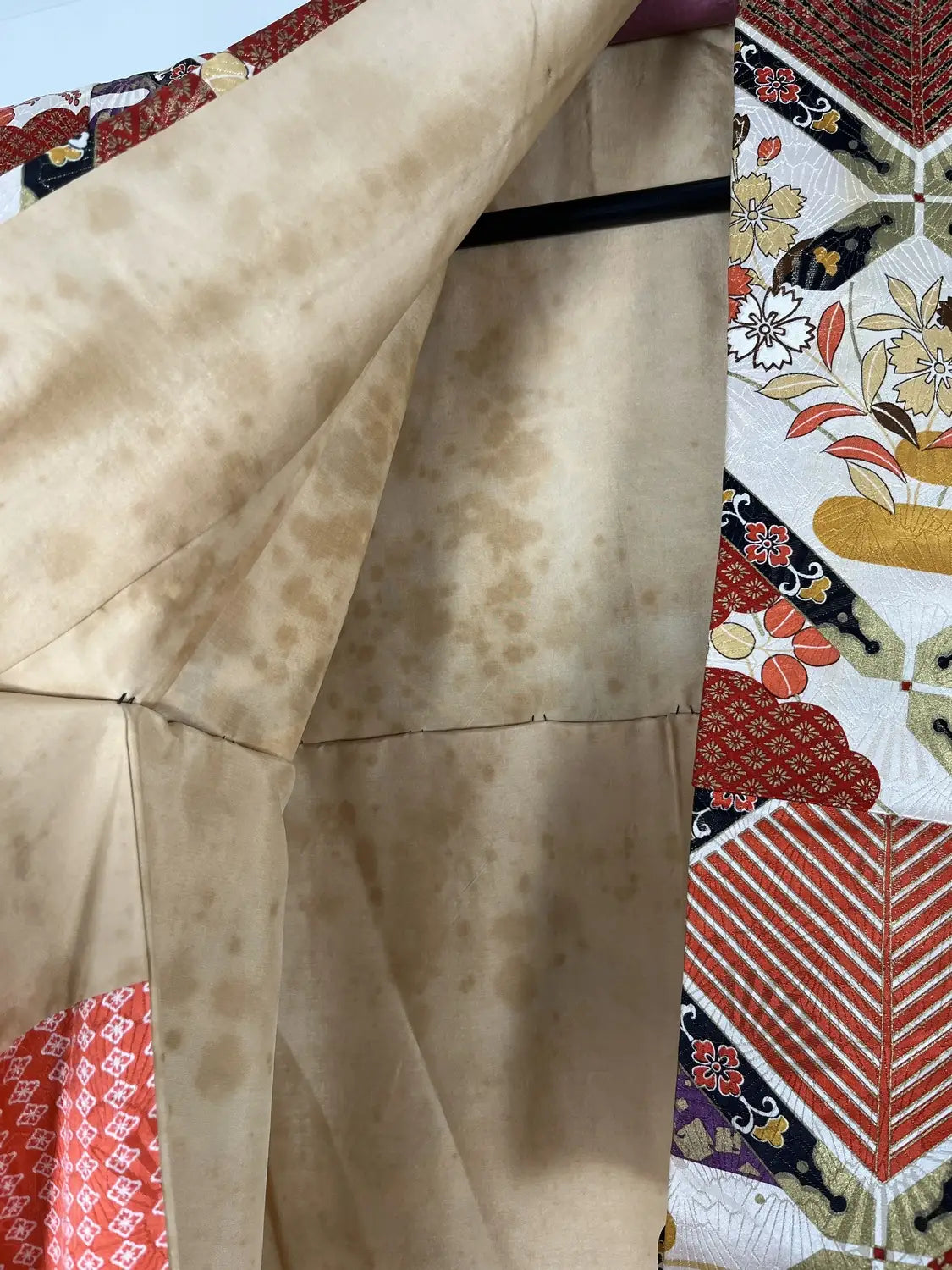 If preferred, you can simply remove the tucks by cutting the thread for a more relaxed silhouette. For a kimono, it’s in very good condition overall, but there are some stains and marks. If you are concerned about these, please refrain from purchasing. When new, this piece could easily have been priced over €1500.
