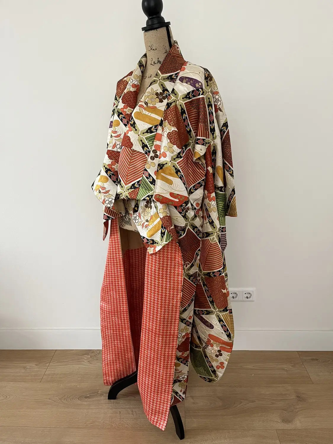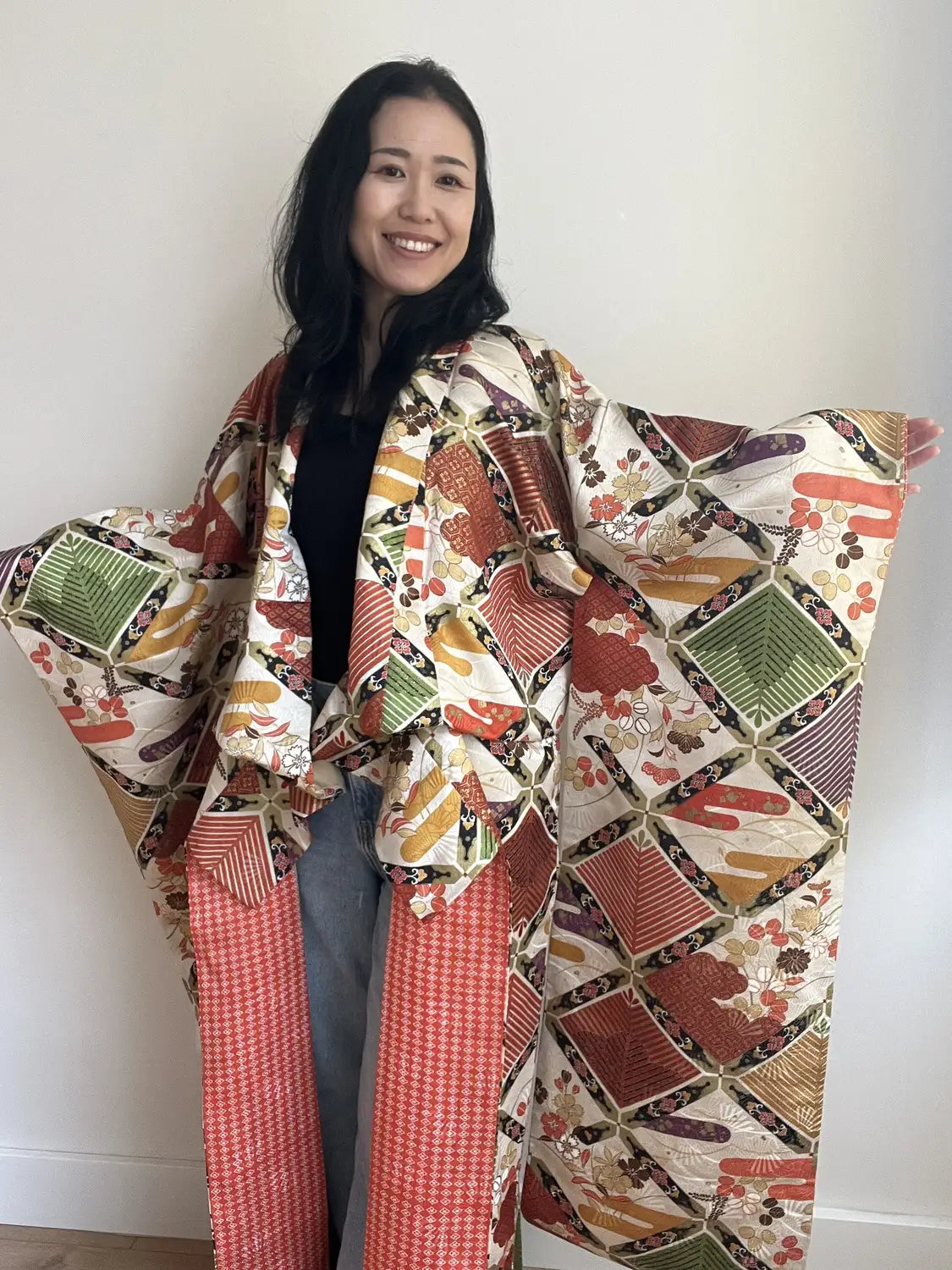 The red hakkake (the inner hem lining) is also quite rare, adding a beautiful sense of movement. It can even be styled in a more dynamic, dress-like manner to highlight this detail.