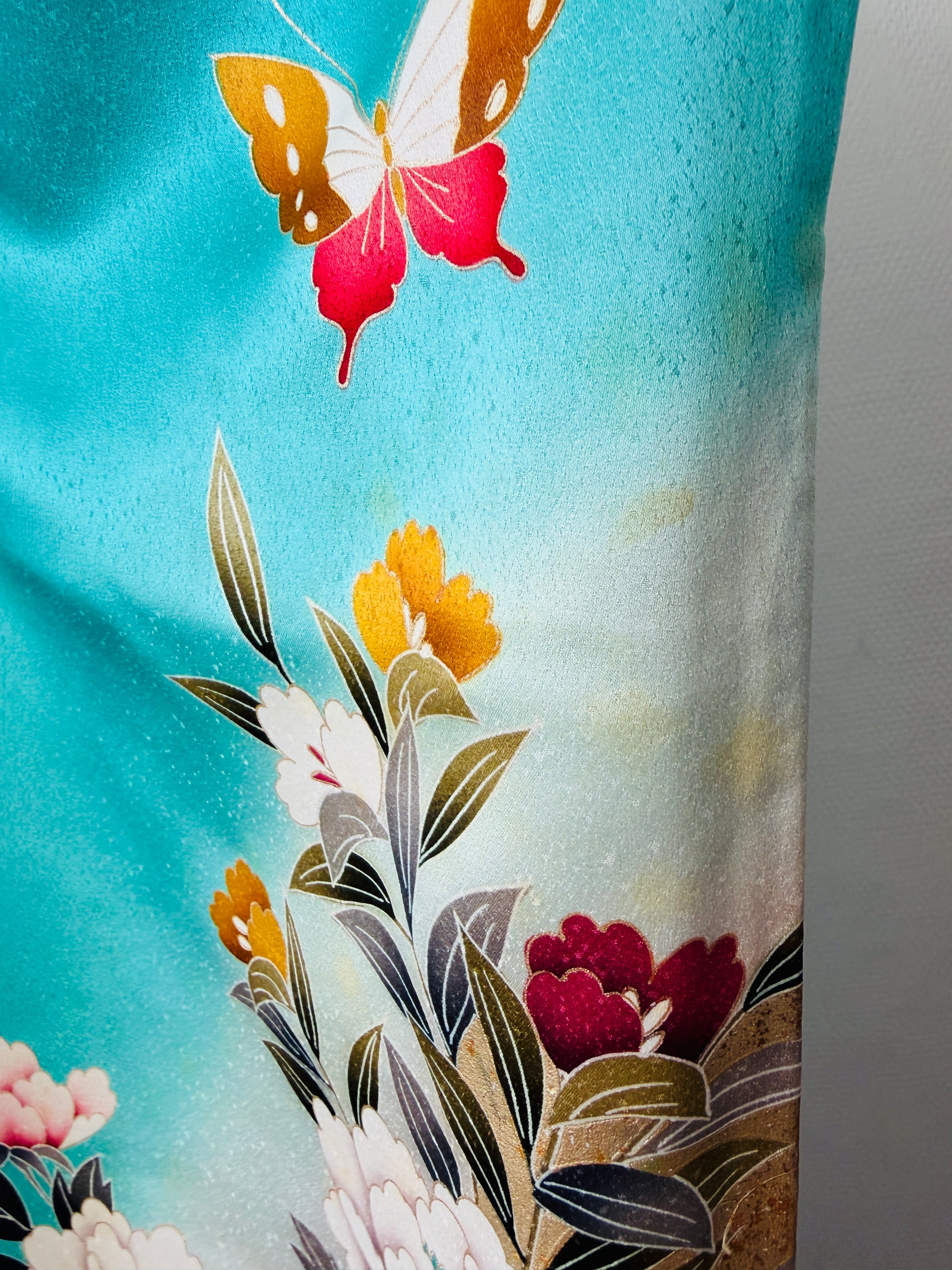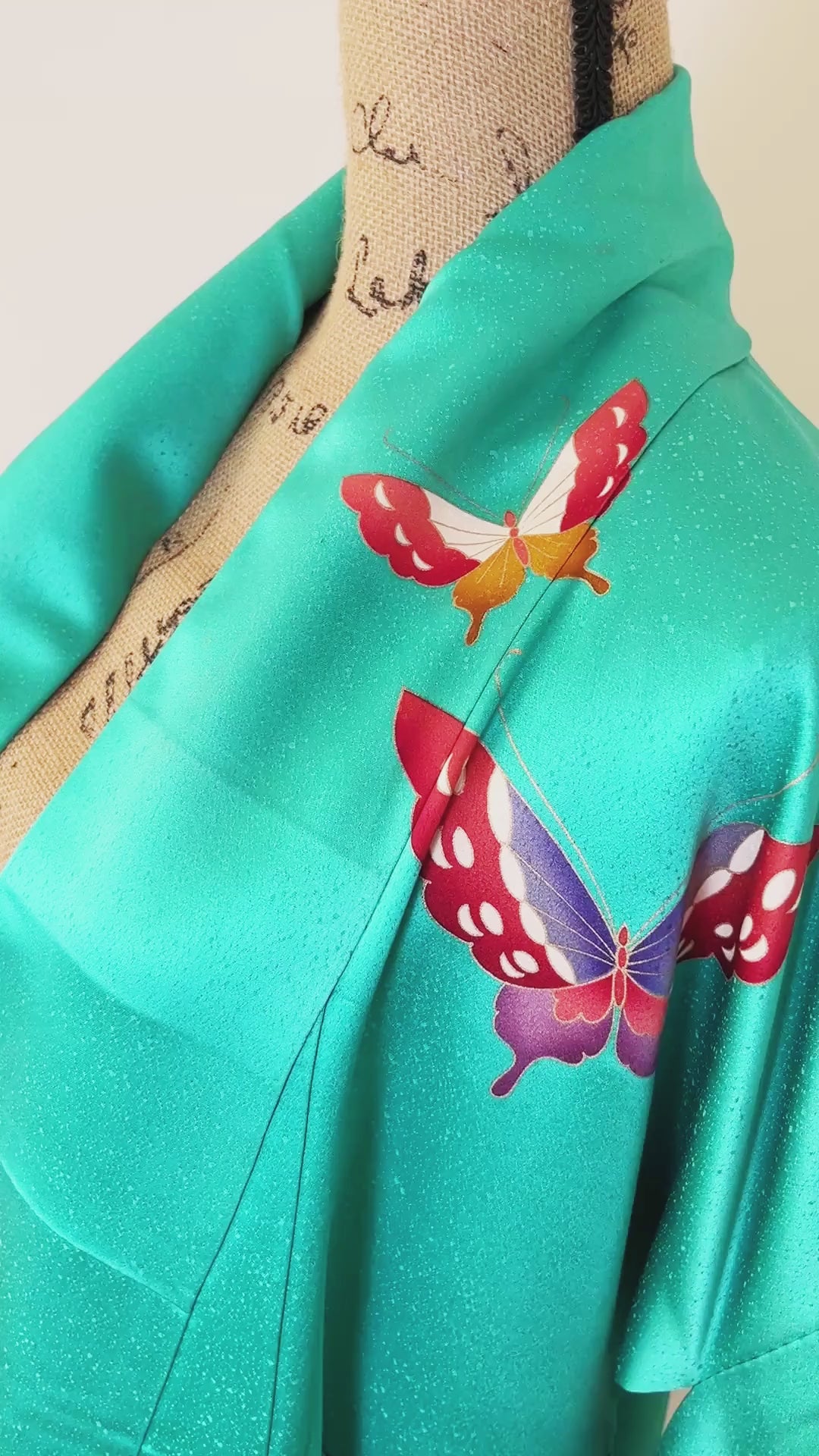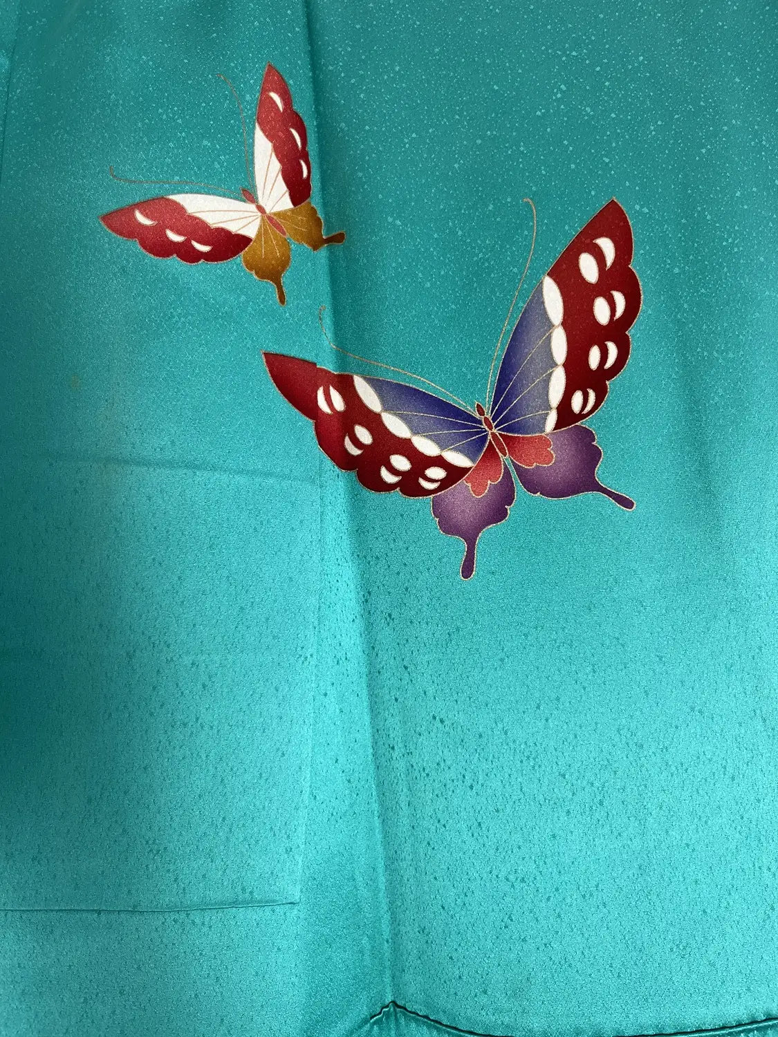 Vintage Furisode - Green Western Floral & Butterfly Motif -