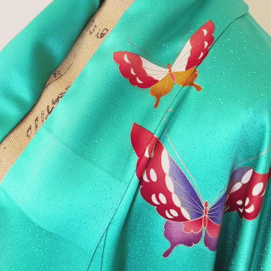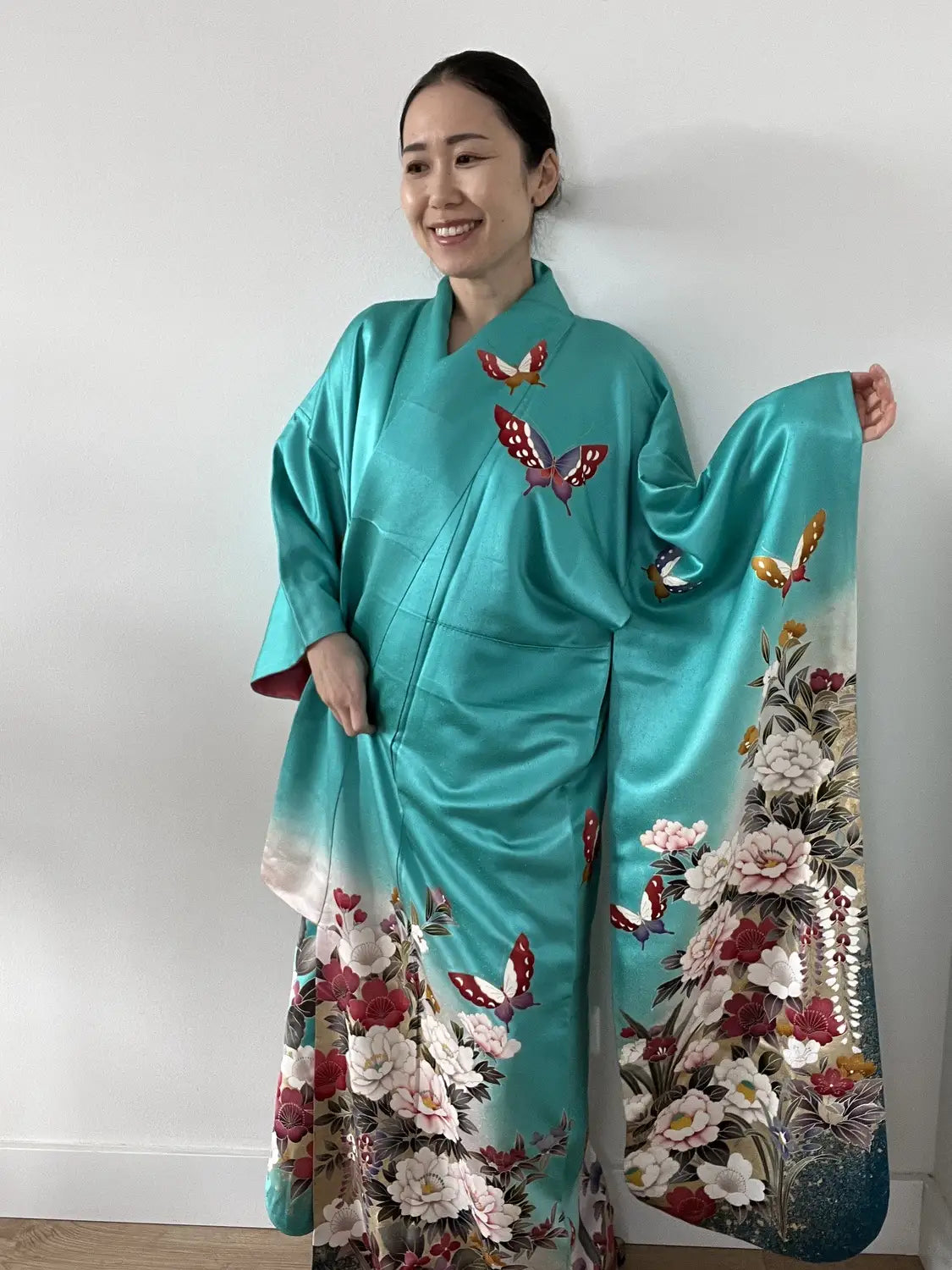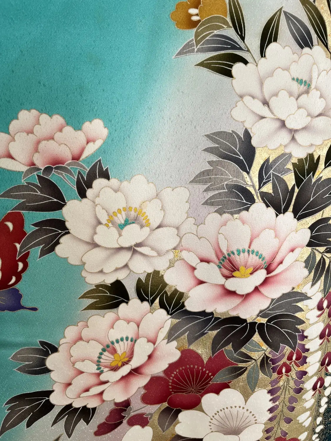 Vintage Furisode - Green Western Floral & Butterfly Motif -
