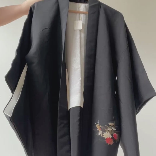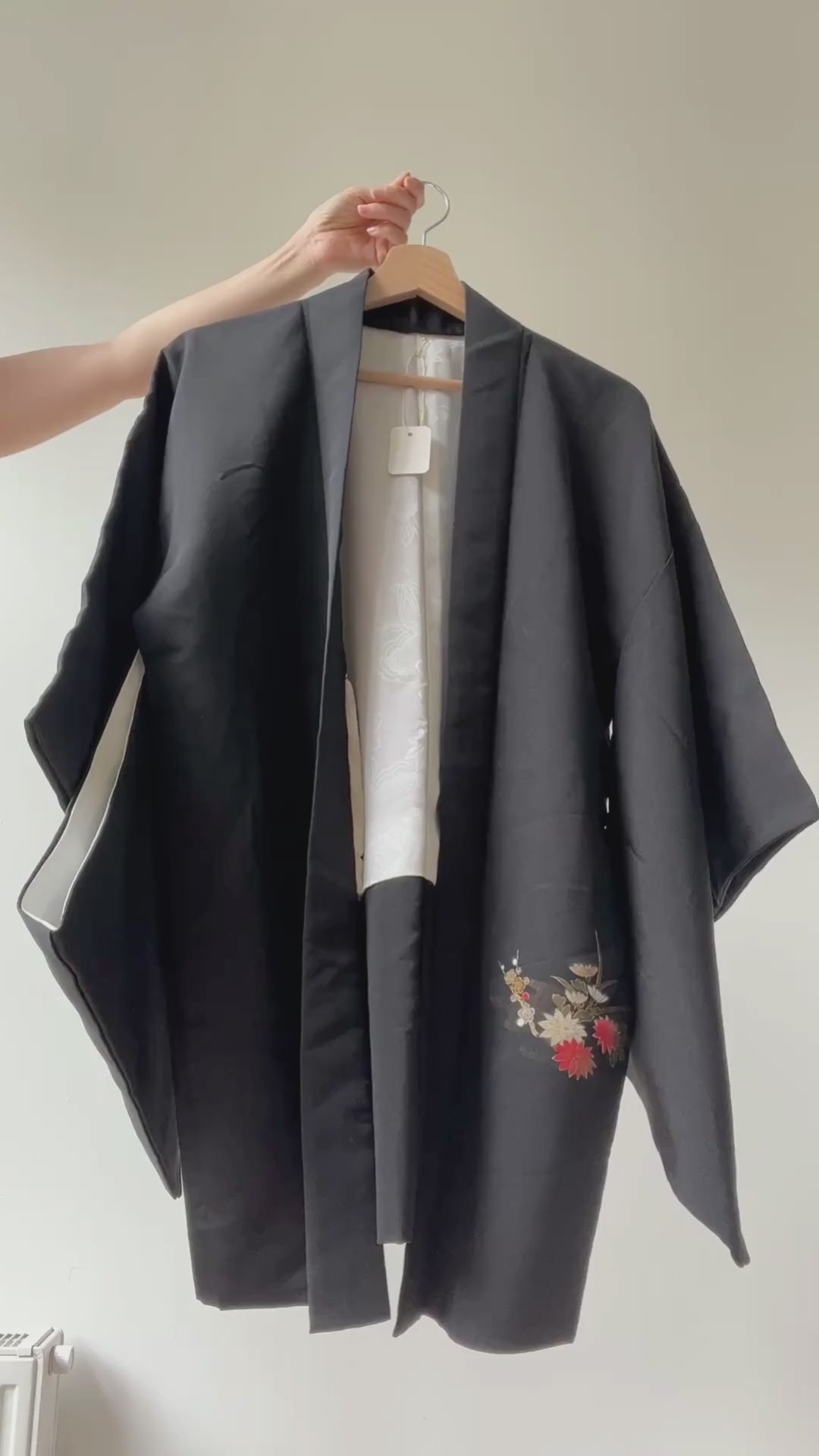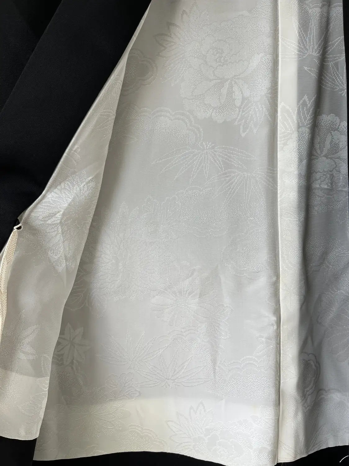 This elegant black haori features a graceful, realistic design of flowing water and seasonal flowers, delicately hand-painted in gold yuzen.