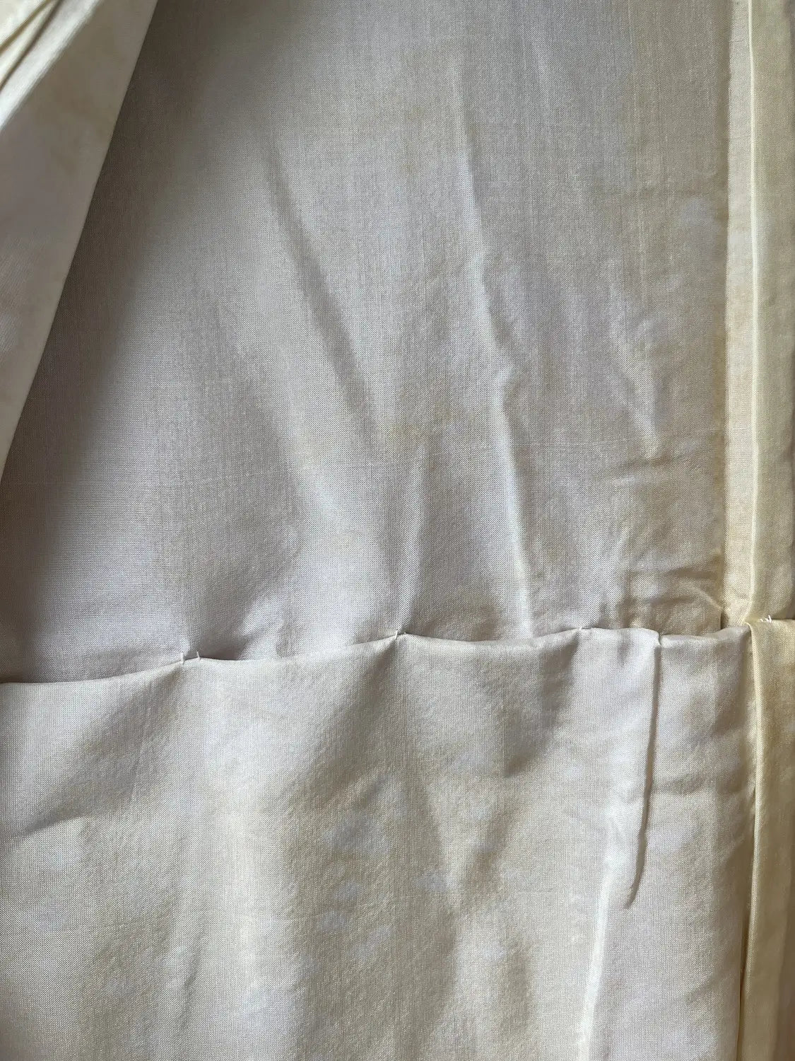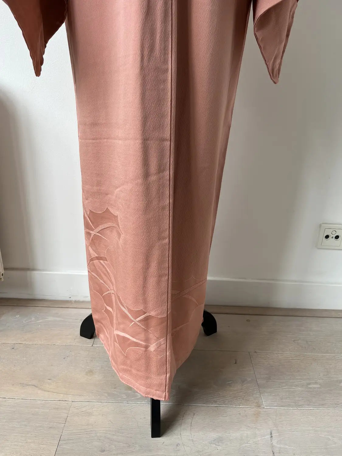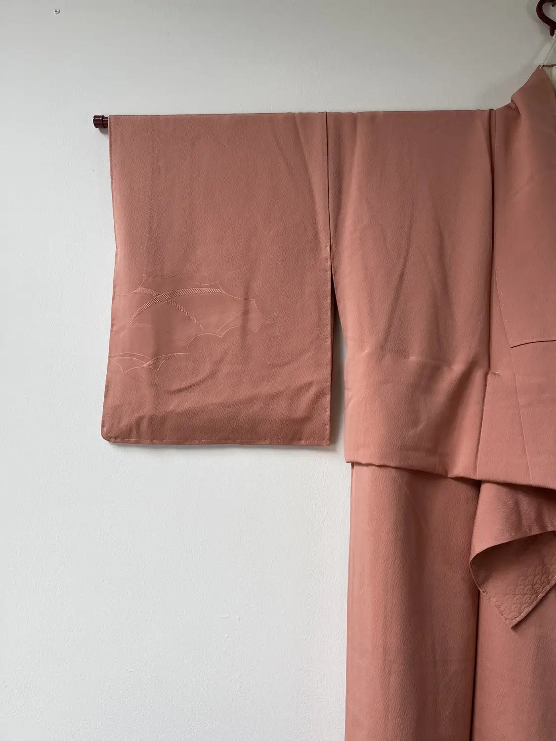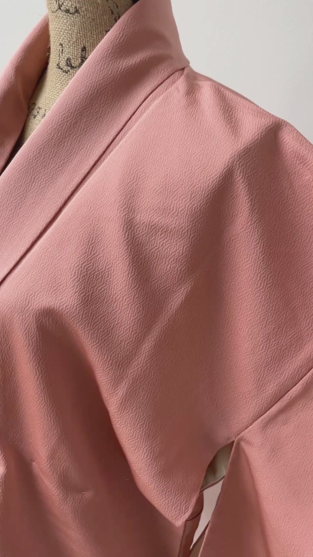 This piece may appear to be an Iromuji at first glance, but upon closer inspection, you’ll notice subtle embroidery and woven patterns around the hem and sleeves, indicating that it is most likely a Tsukesage Houmongi.